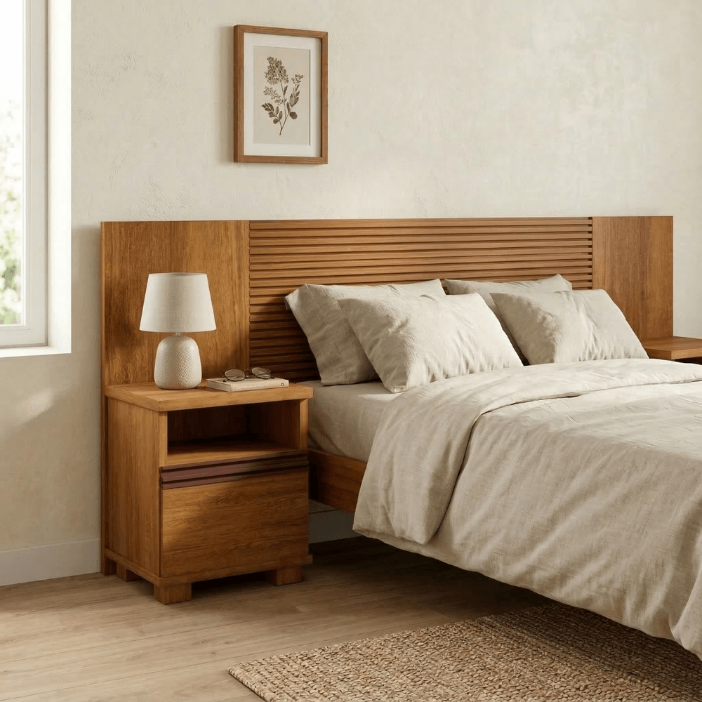 O móvel é compatível com colchões de 138 até 158 cm, garantindo ajuste ideal para diferentes tamanhos de cama. As mesas laterais integradas possuem gavetas com corrediças telescópicas, permitindo acesso fácil e suave aos objetos do dia a dia, enquanto os puxadores proporcionam manuseio confortável.