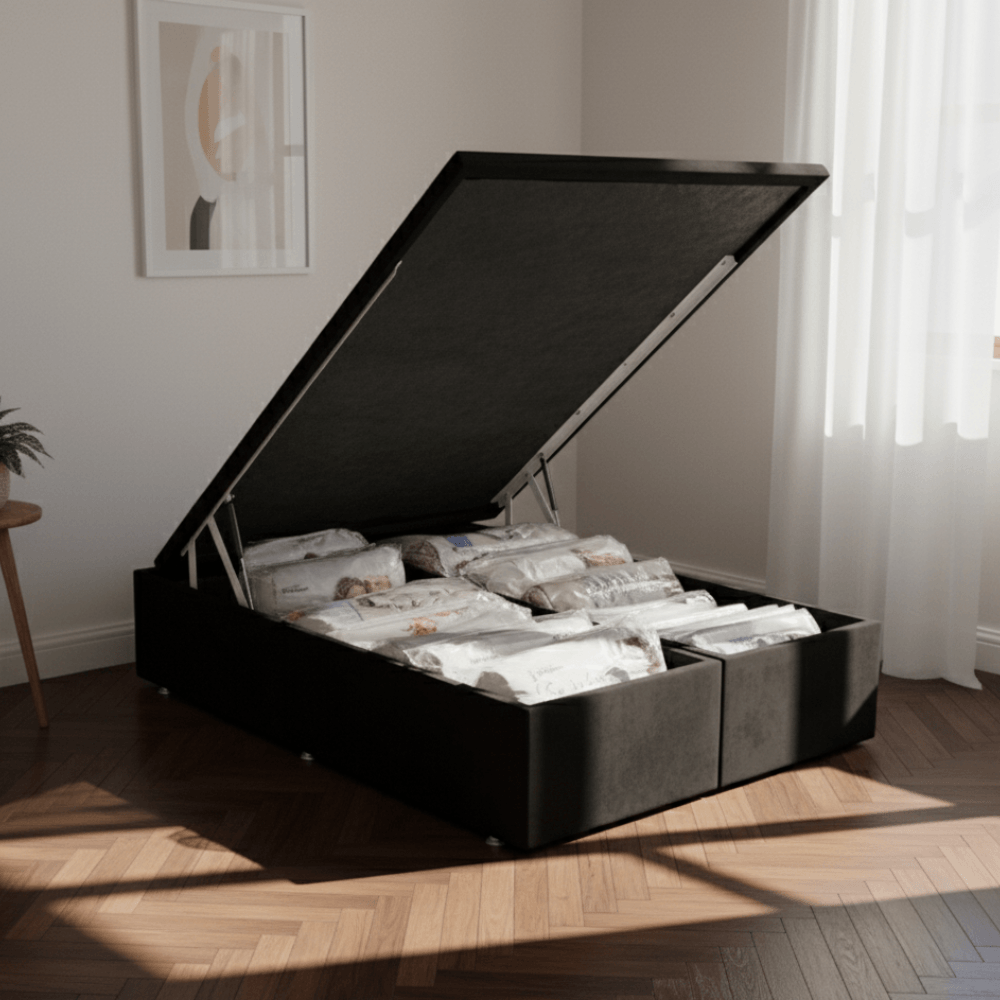 O sistema de amortecimento pneumático facilita a abertura do baú sem esforço, enquanto a alça de apoio mantém o colchão firme ao movimentar a base. Além disso, os pés rosqueáveis permitem ajuste em desníveis do piso, proporcionando estabilidade. Por ser bipartido, o box otimiza a organização do ambiente e facilita o transporte e a montagem.