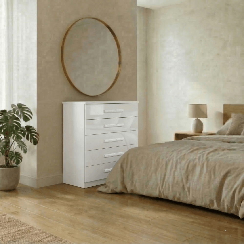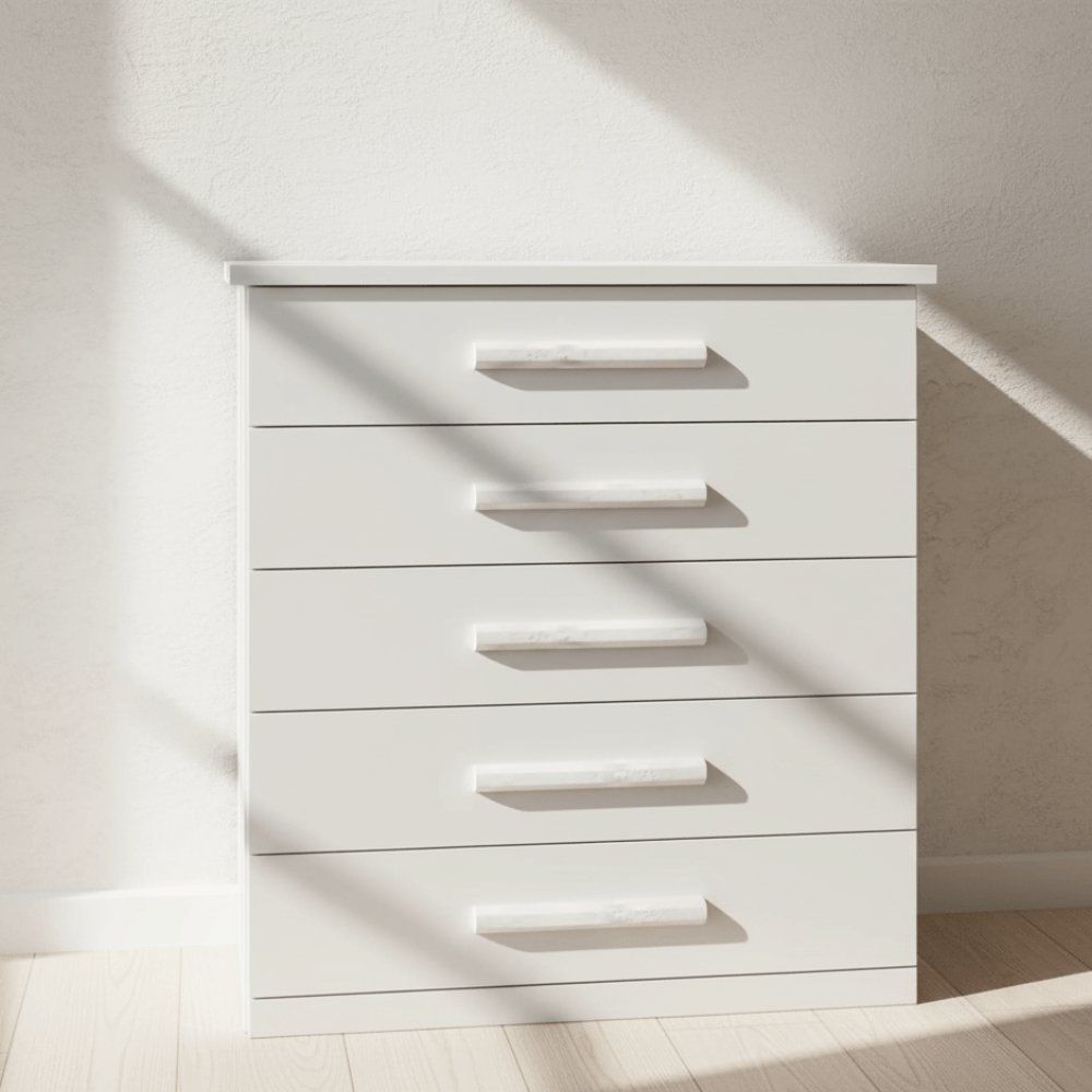 Conta com 5 gavetas equipadas com corrediças telescópicas, proporcionando abertura suave e acesso completo ao conteúdo. Os puxadores em madeira adicionam um detalhe de acabamento elegante ao móvel.