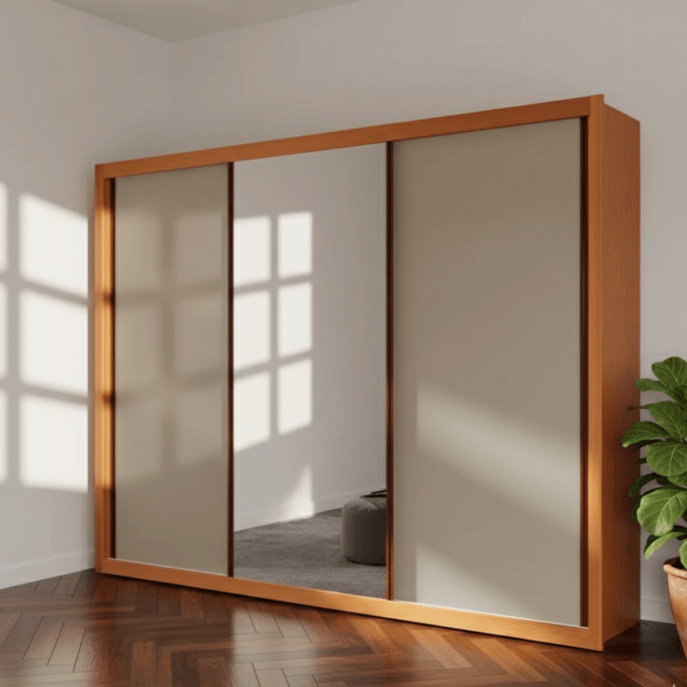Seu sistema deslizante premium com roldanas reguláveis com molas e trilho inferior em alumínio garante um deslizar suave e silencioso das portas. As gavetas possuem corrediças telescópicas para abertura total e acesso facilitado, enquanto os puxadores em alumínio trazem durabilidade e elegância.