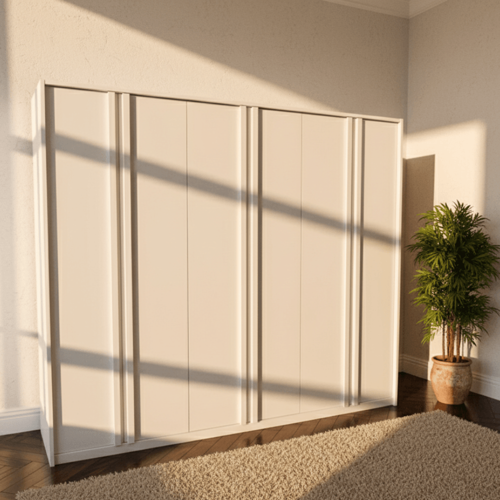 Fabricado em 100% MDF, oferece resistência e qualidade superior. Possui seis portas de bater com acabamento refinado, corrediças telescópicas que garantem abertura suave e durabilidade, e trilhos de alumínio para maior resistência. O design inclui puxadores em MDF e cabideiros em alumínio, que combinam praticidade e estilo.