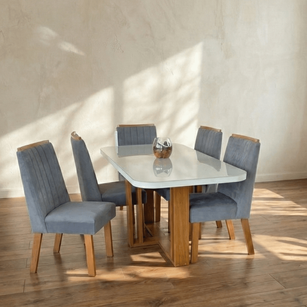 Mesa de Jantar Dakota 180cm Vidro Offwhite + 6 Cadeiras Tecido 2036 - Naturale