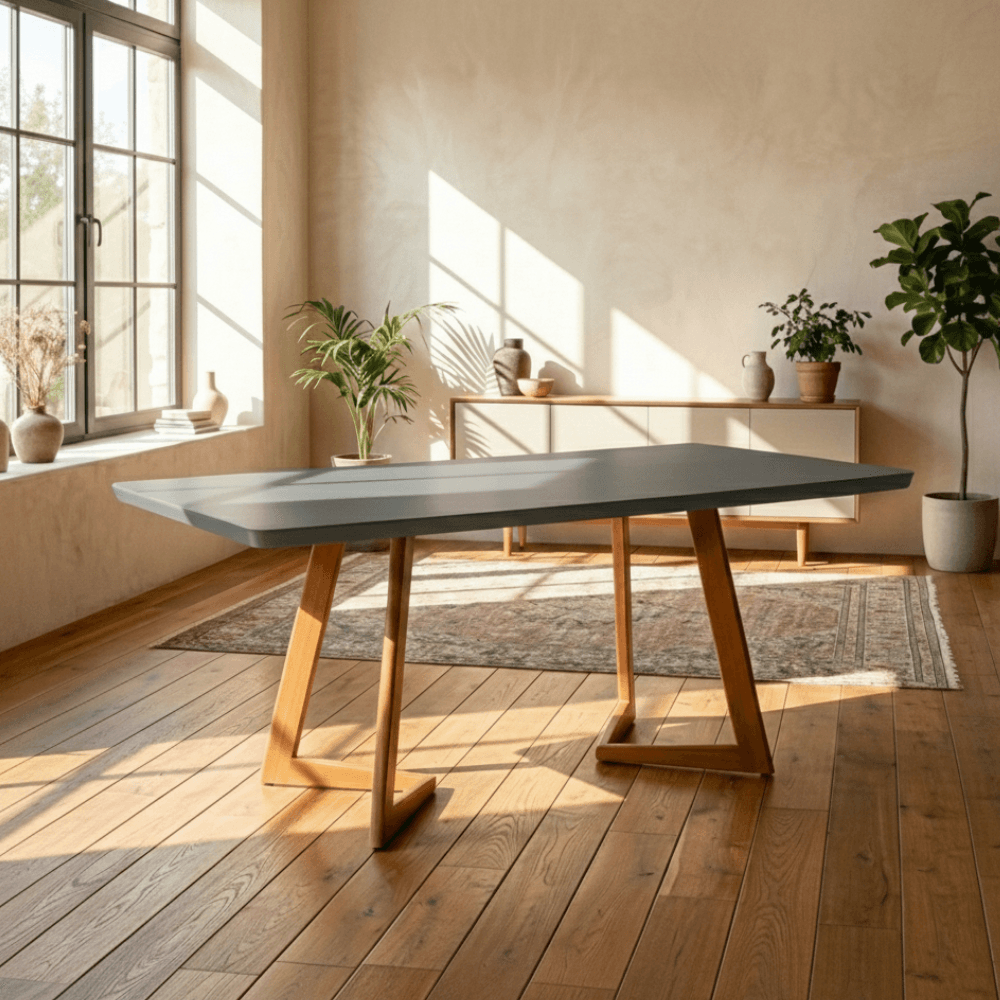 Sua base em madeira maciça proporciona resistência e durabilidade, enquanto o tampo em MDF laqueado com vidro serigrafado agrega um acabamento sofisticado e facilita a manutenção. Trata-se de uma peça versátil, que atende tanto às necessidades de uso quanto à composição estética do ambiente.