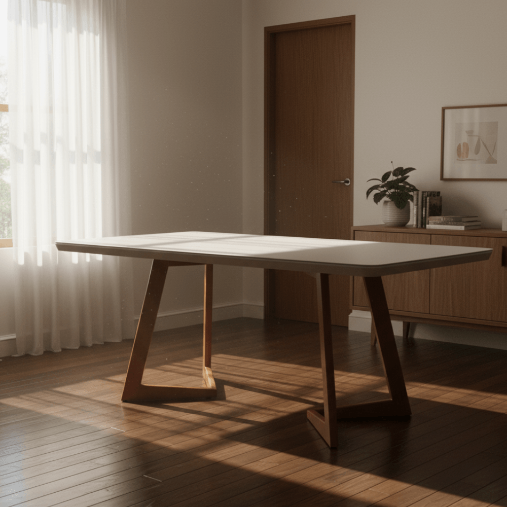 A base em madeira maciça proporciona resistência e estabilidade, enquanto o tampo em MDF laqueado com vidro serigrafado oferece um acabamento uniforme e facilita a manutenção. Trata-se de uma peça funcional, pensada para atender às necessidades de uso e à composição visual do ambiente.