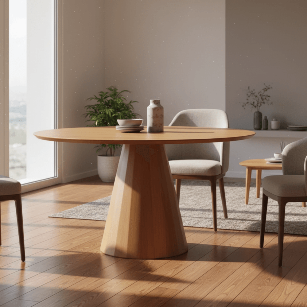 - Base: Cônica com 20 faces, que realçam os detalhes da madeira e proporcionam leveza ao espaço