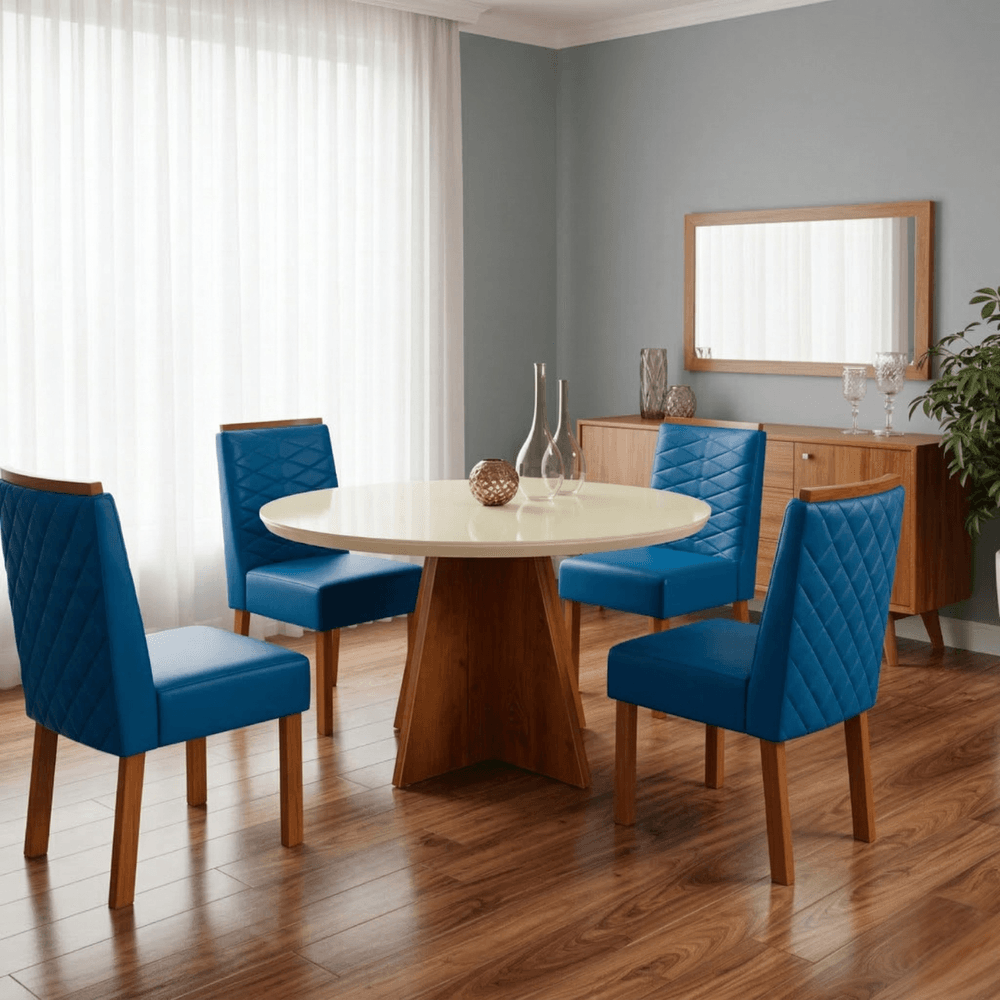 Mesa de Jantar Lisboa com Vidro Offwhite - 100cm + 4 Cadeiras Dafne Azul