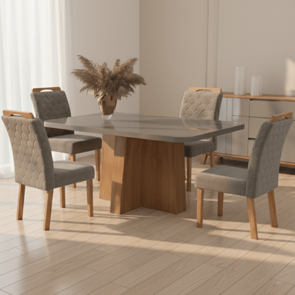 As cadeiras revestidas em tecido suede oferecem toque macio e aconchegante, proporcionando conforto aos convidados. O espaço para quatro pessoas é ideal para reunir familiares e amigos em momentos de alegria e descontração. Cada detalhe do acabamento é cuidadosamente trabalhado, garantindo um visual impecável e atraente.