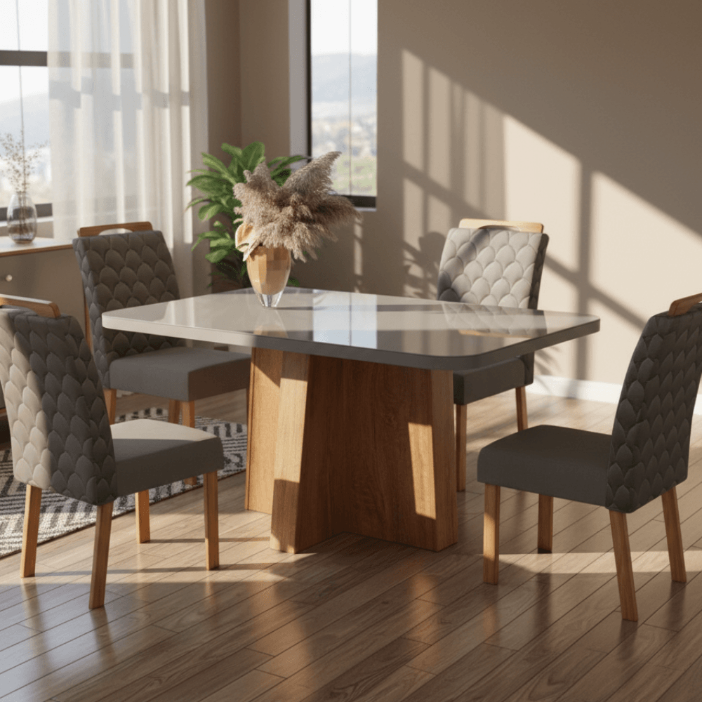 As cadeiras em tecido suede oferecem toque macio e aconchegante, garantindo conforto para todos os convidados. Com espaço para quatro pessoas, é ideal para reunir familiares e amigos em momentos de alegria e descontração. Cada detalhe do acabamento é cuidadosamente trabalhado, assegurando um visual impecável e atraente.