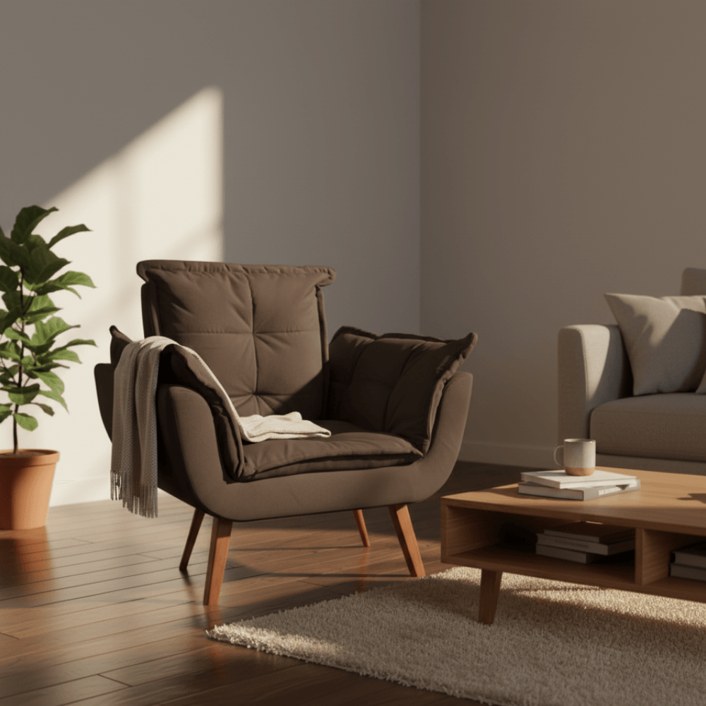 O assento é produzido em espuma D28, enquanto o encosto conta com espuma D20, oferecendo sustentação e conforto equilibrados. Sua estrutura é feita em madeira de reflorestamento ecológica, que garante resistência e durabilidade, e os pés em madeira pintada complementam o acabamento elegante da peça.
