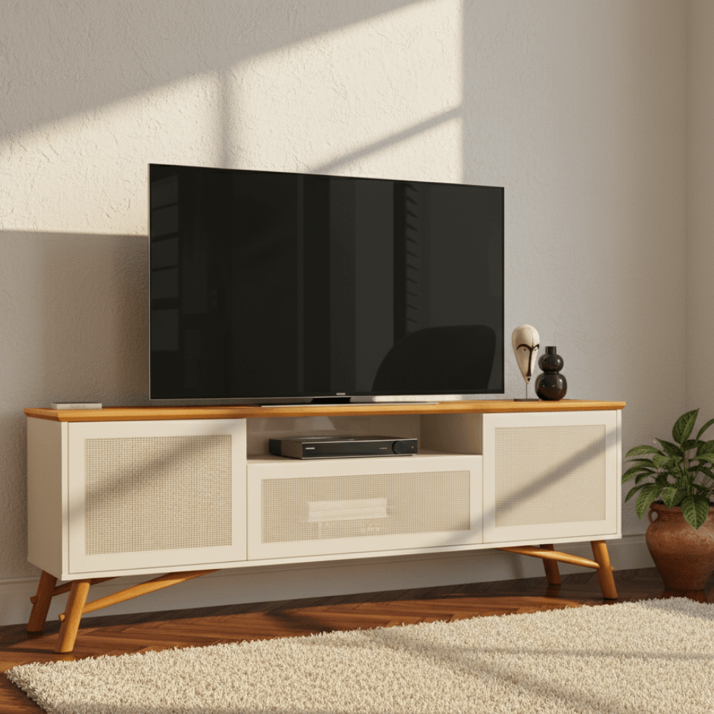 Possui tampo em MDF de 25 mm, 1 porta basculante, 2 portas articuladas, acabamento em Rattan sintético, pés de madeira (pinus) com design exclusivo e espaço para acomodar aparelhos eletrônicos com praticidade.