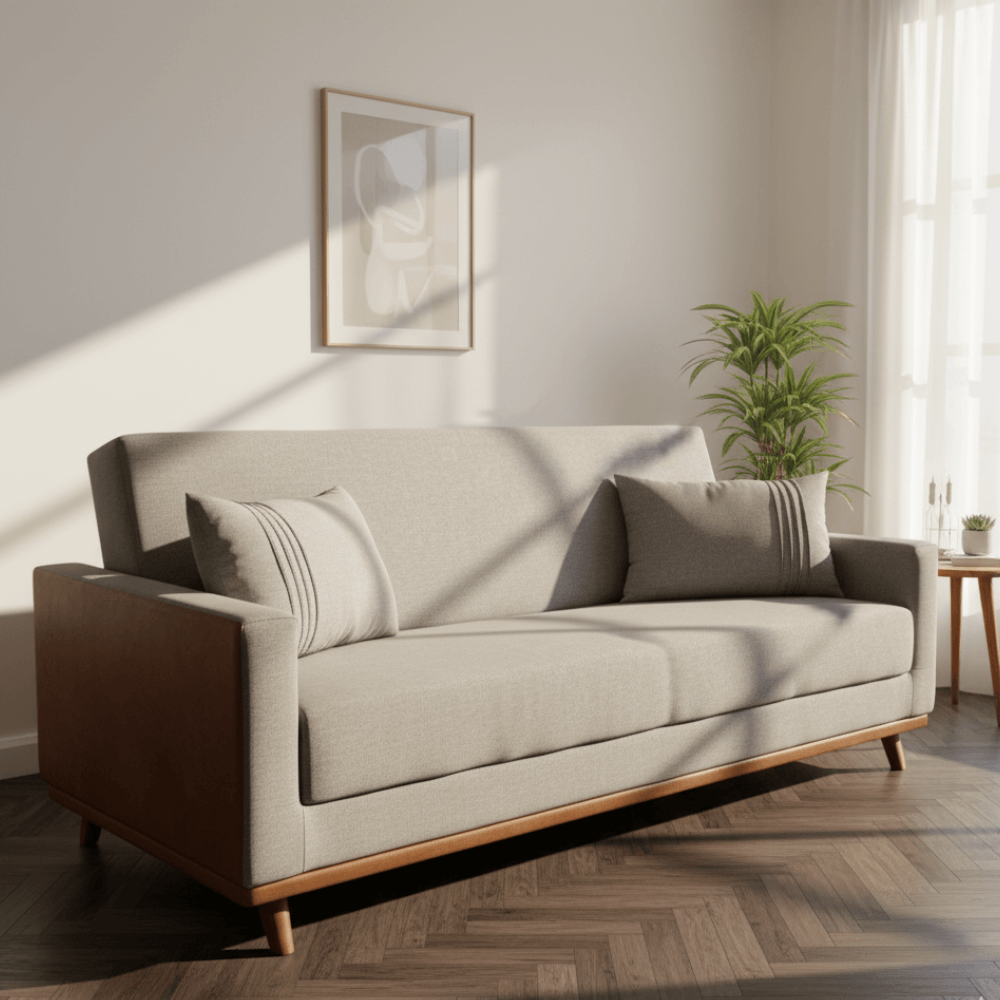 O sofá cama apresenta funcionalidade inteligente, permitindo otimizar o espaço sem comprometer o conforto. As almofadas decorativas com costuras pantográficas adicionam um toque de elegância ao design do móvel.