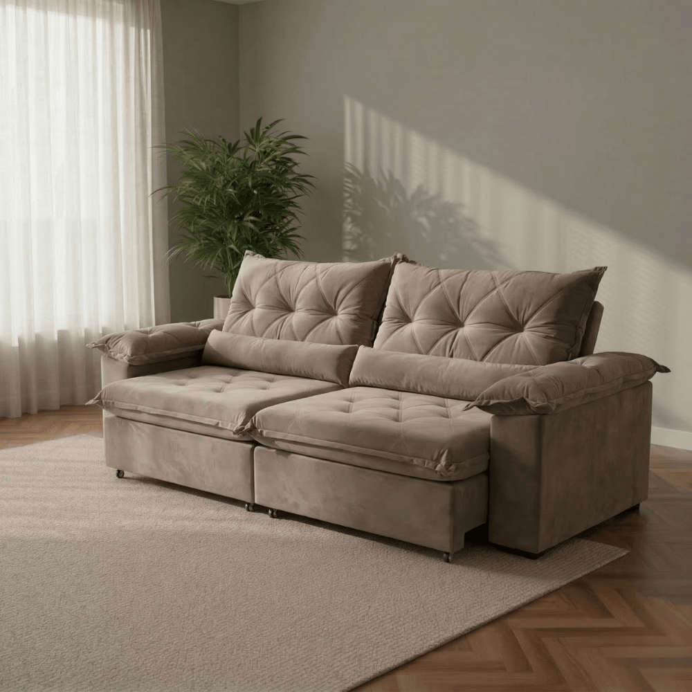 O modelo conta com assentos retráteis que, quando abertos, atingem até 1,80 m de profundidade, proporcionando espaço extra para esticar as pernas e relaxar. Essa versatilidade torna o Sofá Ouro Preto perfeito tanto para salas amplas quanto compactas, garantindo conforto sem abrir mão da funcionalidade.