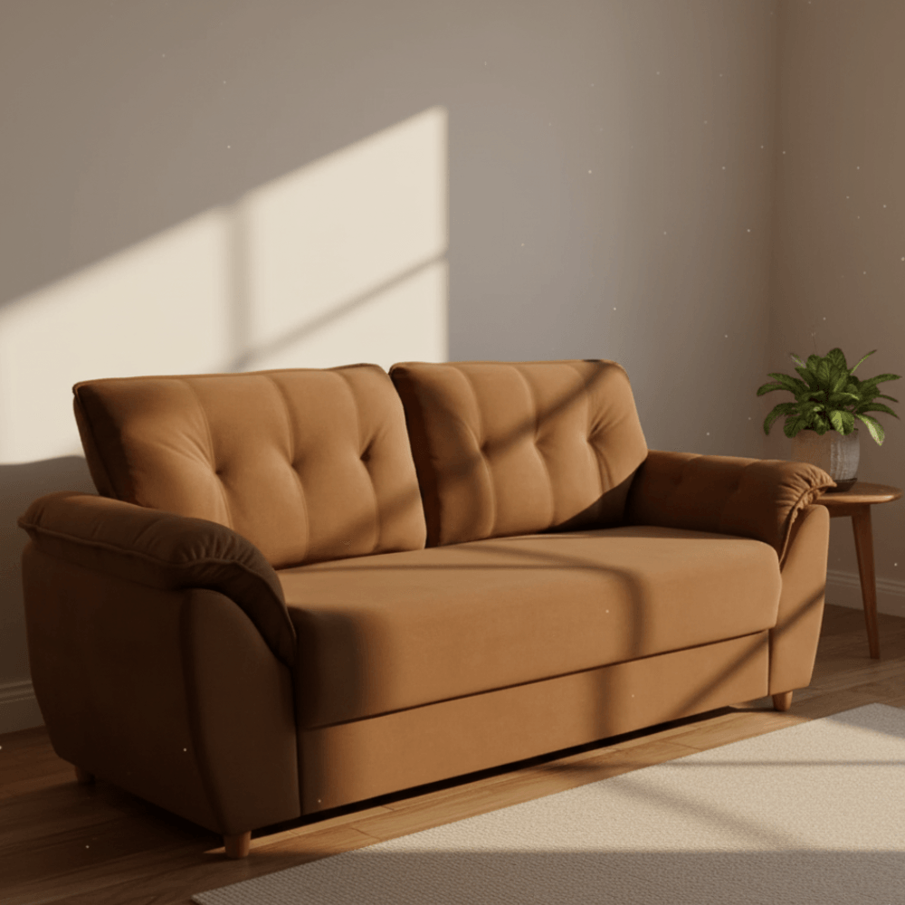 O modelo possui pés em madeira maciça, complementando a base estrutural do sofá.